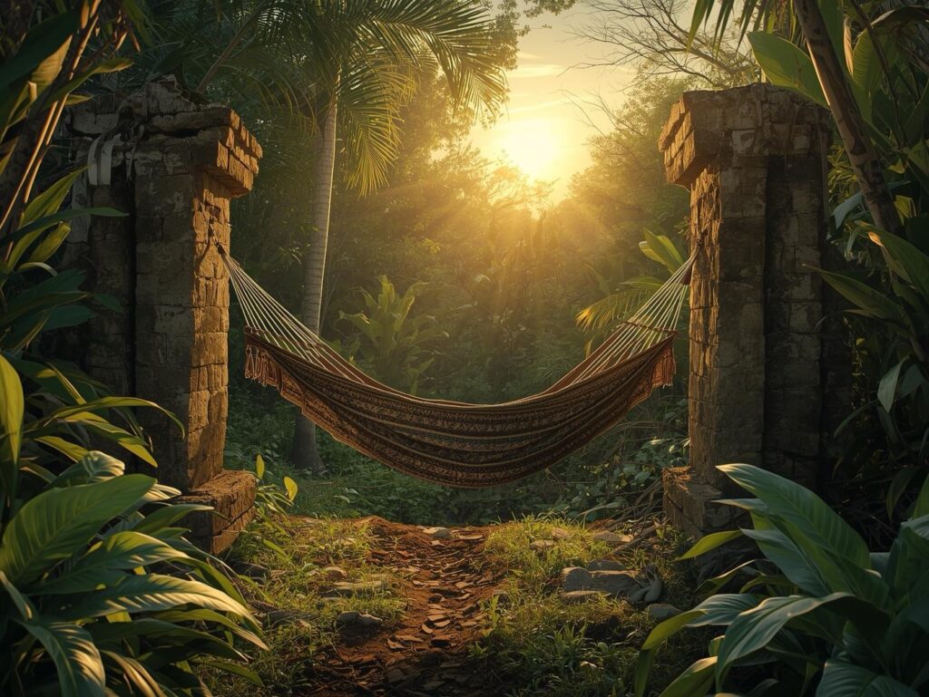 ハンモックの歴史は数百年前にさかのぼります。起源は中南米のマヤ文明やカリブ海の先住民族にあり、木々の間に吊るして眠るための「寝具」として誕生しました。当時は地面に直接寝ると害虫や湿気の影響を受けるため、空中に吊るすことで清潔かつ安全に眠ることができたのです。素材は主に樹皮や植物繊維。自然の中で生活していた人々にとって、ハンモックは暮らしを守る知恵の一つでした。
