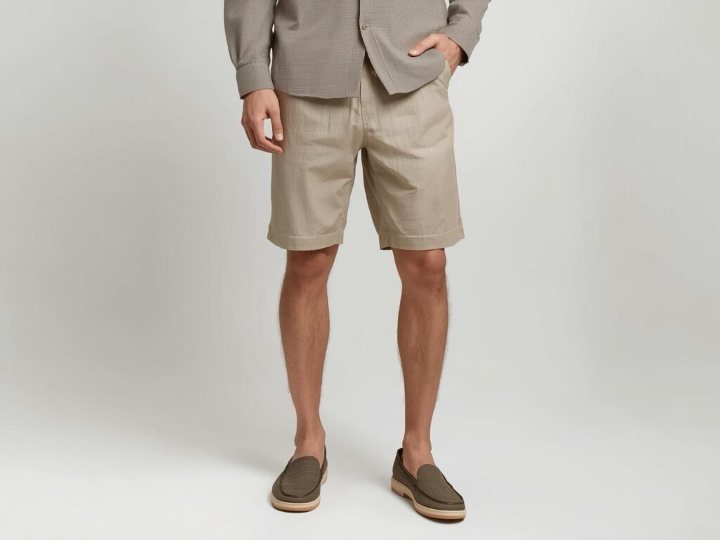 休日スタイル:ベージュのショートパンツにスリッポンを合わせれば、リゾート感漂う軽やかなコーデ。