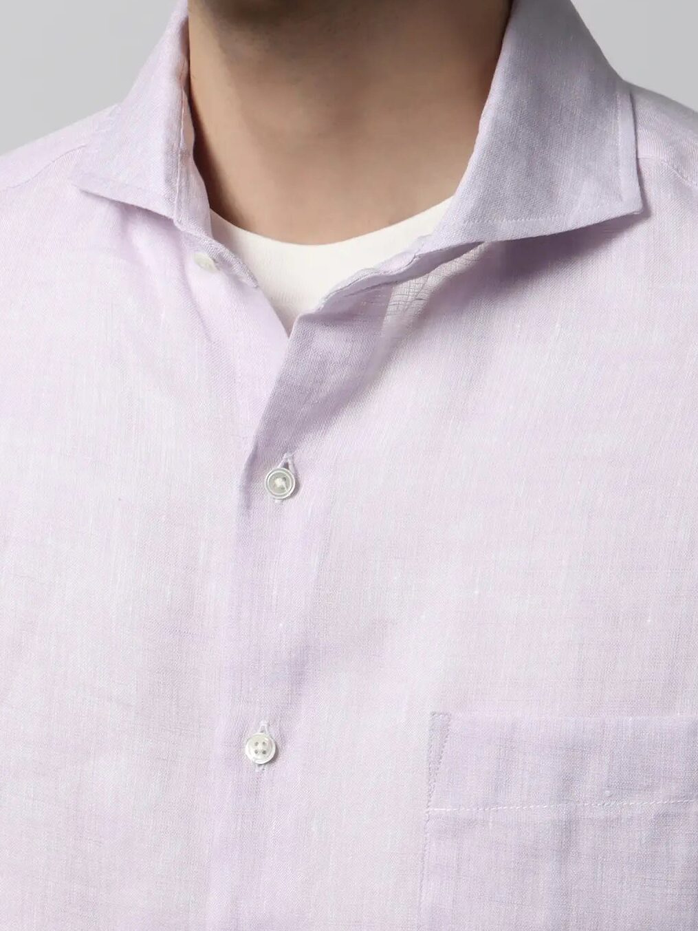 カッタウェイ襟のリネンシャツは、幅広いシーンに対応できます。