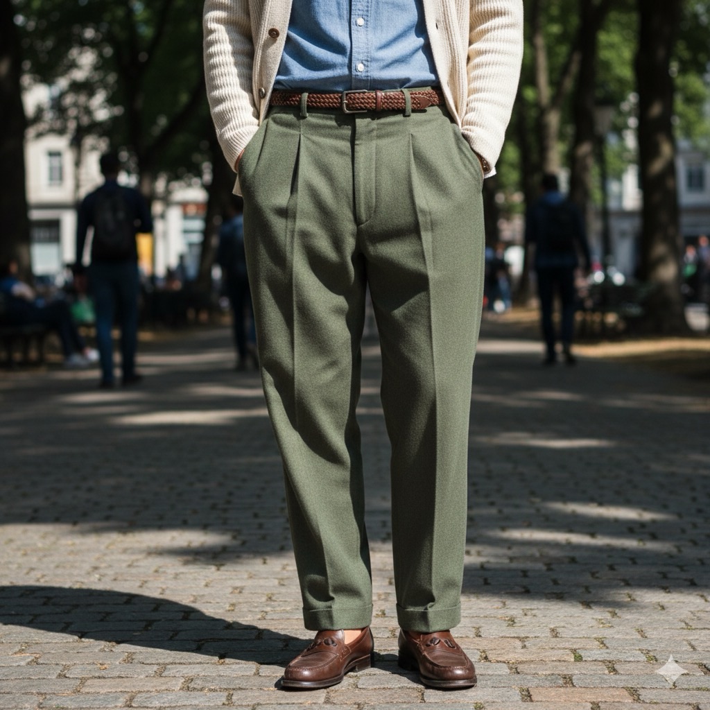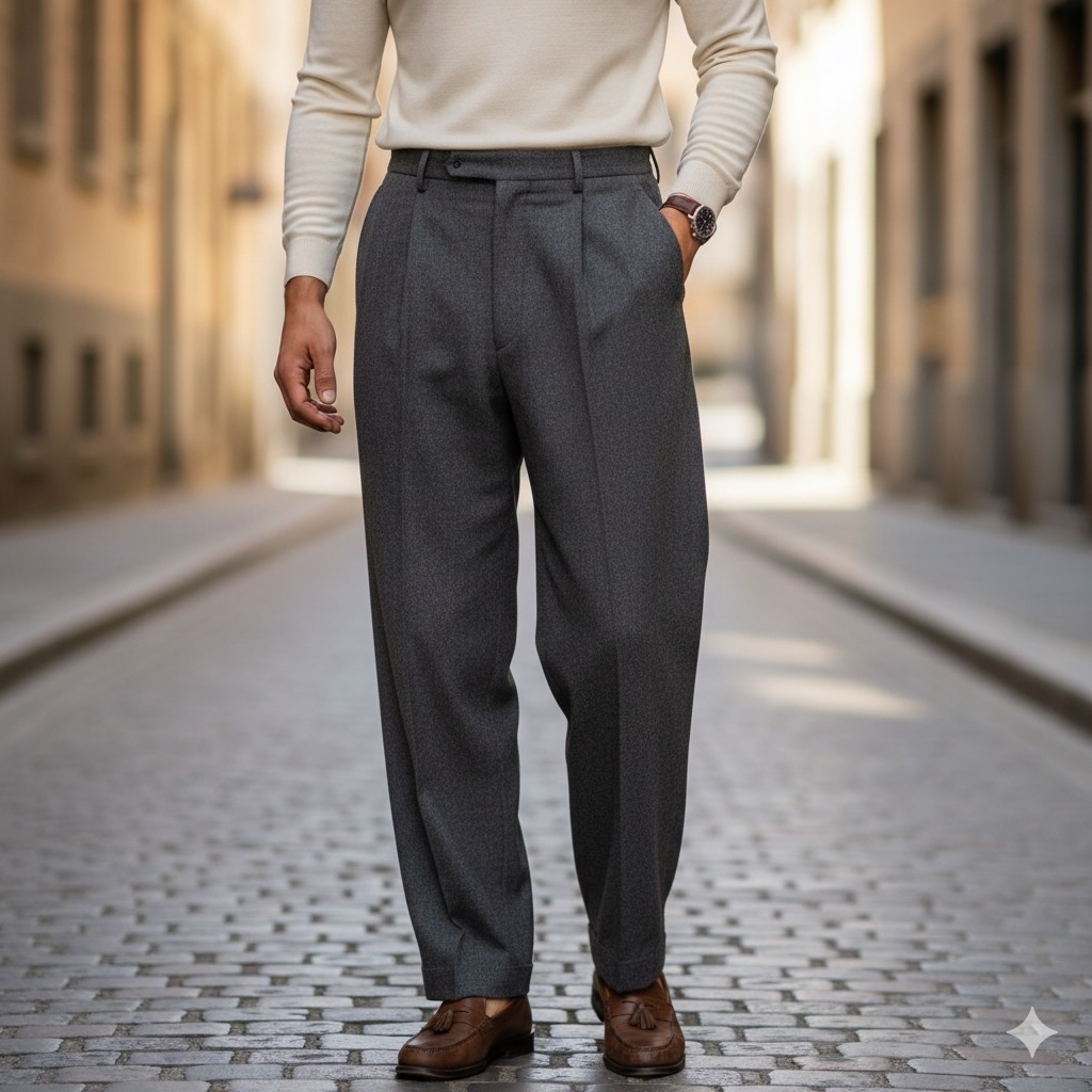戦後から1980年代にかけては、ツータックが主流でした。当時は余裕のあるシルエットが「大人の品格」を表すとされ、多くのビジネスマンが履いていました。特に団塊世代にとって、ツータックパンツは正装の代名詞といえます。