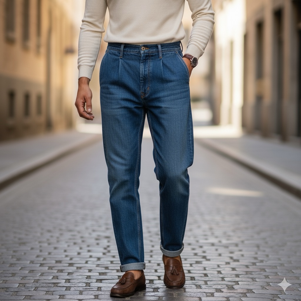 デニムといえばカジュアルの代名詞。しかし、そこにワンタックを加えることで「きちんと感」と「快適さ」を両立できます。通常のデニムより腰回りにゆとりがあり、座ったときのストレスが軽減されます。